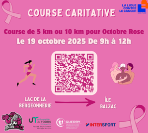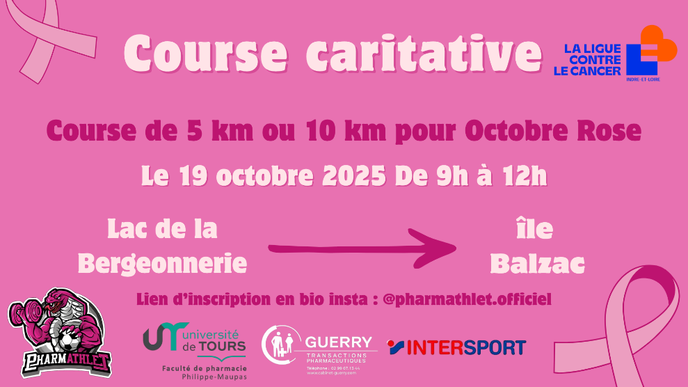 L’association étudiante Pharm’athlet de la faculté de Pharmacie de Tours, organise une course caritative qui se déroule le 19 octobre 2025 de 9h à 12h. Elle s’étendra du Lac de la Bergeonnerie à l’Ile Balzac dans le cadre d’Octobre Rose (lutte contre le cancer du sein). Vous serez environ 200 participants à courir pour cette noble cause. Tous les bénéfices seront reversés à la Ligue contre le cancer d’Indre et Loire.